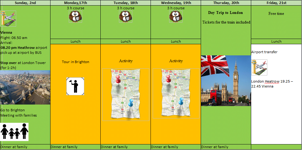 | Flug ab Wien mit Austrian Airlines Hinflug: Sonntag, Wien 6:50-8:20 Heathrow Ruckflug: Freitag, Heathrow 19:25-22:45 Wien Unterbringung bei Gastfamilien mit Vollpension 9 stunden pro Woche Algemeines English in gemischten Klassen (von Mondag bis Mittwoch) Lernmaterialien Aktivitäten: City Tour Seven Sisters English Cream Tea Exkursionen: Kurzstopp am Anreisetag London Tower Eine Tages Exkursion nach London Stornoversicherung für Schulgruppen auf Wunsch sind weitere Versicherungen für LehrerInnen und Schüler möglich.Preis pro Schüler auf Anfrage. |