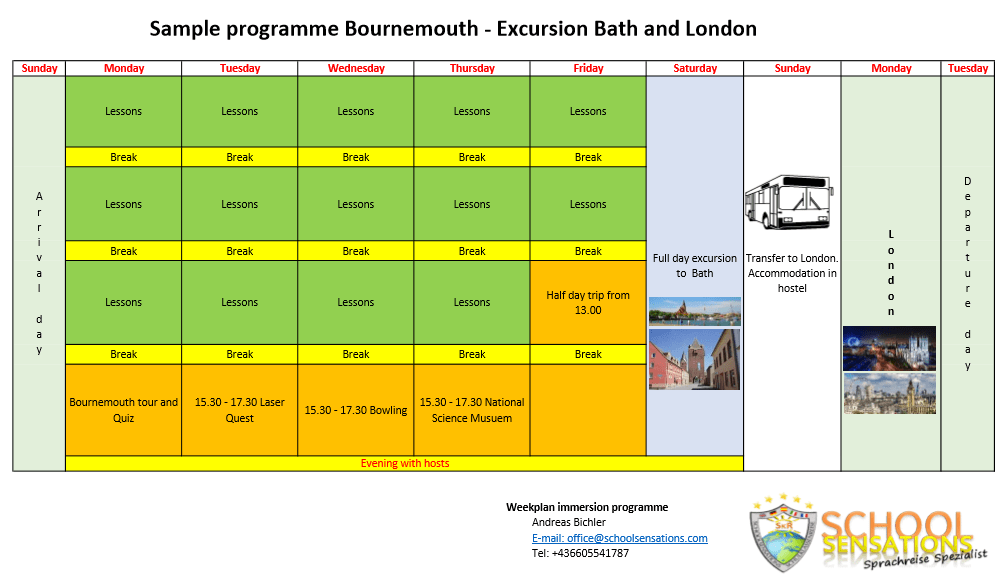 - Montag: Schule von 9.00 – 15.00 Uhr, Orientierungstour in Bournemouth Tour und Quiz