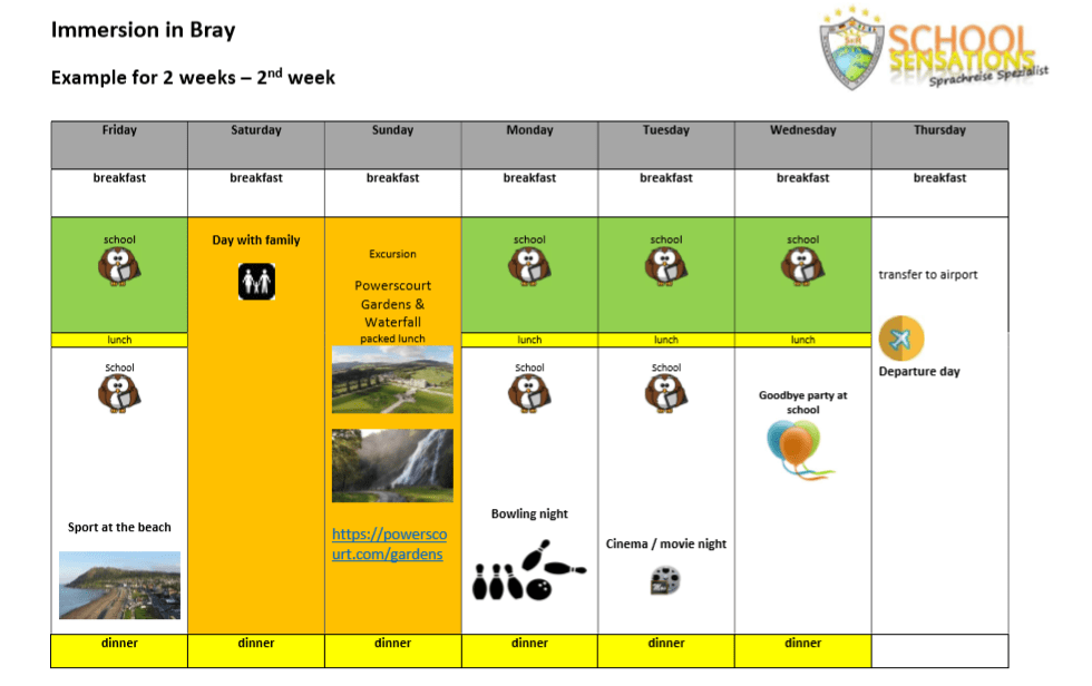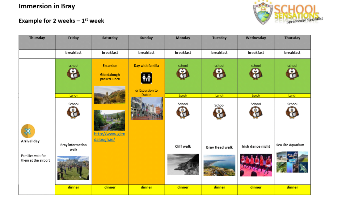 Schoolsensations & LAI bieten für Schüler und Schulgruppen die Möglichkeit von Immersion Programmen in Irland. Die Schüler nehmen täglich von 8.00 – ca. 14.00 Uhr aktiv am Schul-geschehen teil und sind voll ins Programm integriert. Ausgewählte irische Gastfamilien sorgen für die Verpflegung und die Unterkunft während des Aufenthaltes um 100% von der englischen Sprache profitieren zu können.