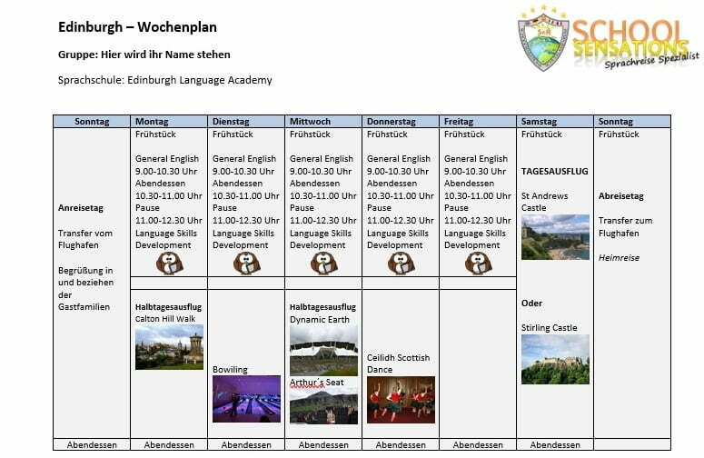 hier finden sie unser Standard-Angebot für die Intensivsprachwoche nach Edinburgh. Ich werde mich bemühen das beste Angebot für sie und Ihre Gruppe zu finden. Es können alle Aktivitäten individuell für sie organisiert werden.