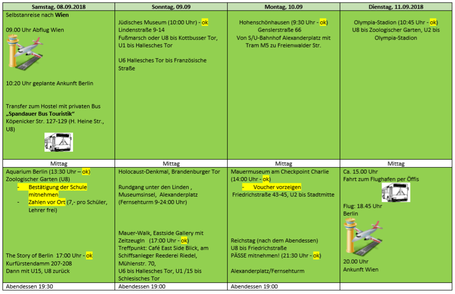 Der Bus wird am Parkplatz auf sie warten und ein Schild mit Schoolsensations (Logo) haben. Die Gruppe müsste zur Haupthalle gehen. Dort, vor der Haupthalle befinden sich die Busparkplätze. Es wird ein silberfarbener Bus sein. Kennzeichen: B- VZ 260.