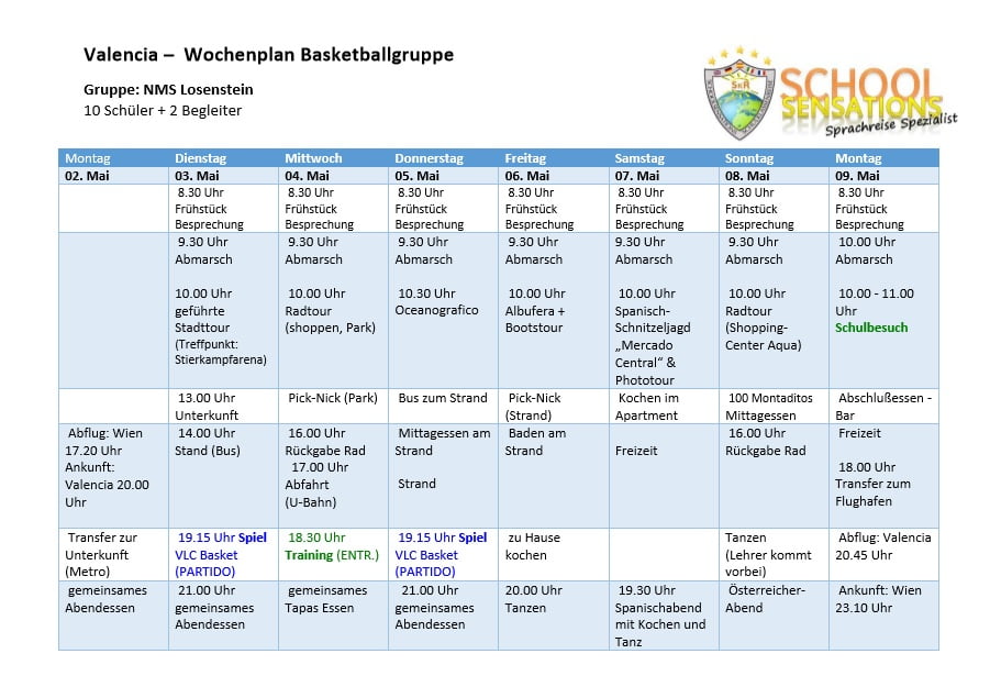 Das Basketballteam der Mädchen zwischen 12 und 14 Jahren der NMS Losenstein (OÖ) aus Österreich fährt für 1 Woche nach Valencia (Spanien) um dort internationale Erfahrung zu sammeln. Die Schulsportgruppe wird mit zahlreichen Mädchen-Sportgruppen gemeinsam trainieren und Freundschaftsspiele organisieren. Ein geführte Stadttour, ein Intensiv-Sprachworkshop, ein spanischer Tanzkurs und ein typischer Tapasabend dürfen dabei natürlich nicht fehlen. Die Mädchen der Sportgruppe aus Losenstein sind schon gespannt auf die neuen Bekanntschaften mit den spanischen Sportmannschaften.