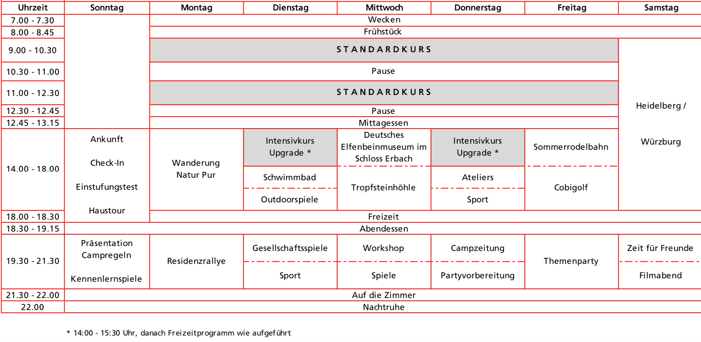 Tag Vormittag Nachmittag Abend Sonntag Zeit für Freunde / Aufräumen Anreise / Einstufungstest / Hausrundgang Kennenlernspiele Montag Einstufungstest / Unterricht Wanderung «Natur Pur» Residenzrallye Dienstag Unterricht Schwimmen oder Fußball Filmabend Mittwoch Unterricht Elfenbeinmuseum im Schloss Erbach Workshop oder Spiele Donnerstag Unterricht Malen im Atelier oder Sport Campzeitung oder Nachtwanderung Freitag Unterricht Sommerrodelbahn Themenparty Samstag Abreise oder Ganztagesausflug Zeit für Freunde The best camp I have ever been is Höchst. It is like a little castle and I met many new friends.