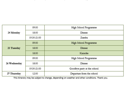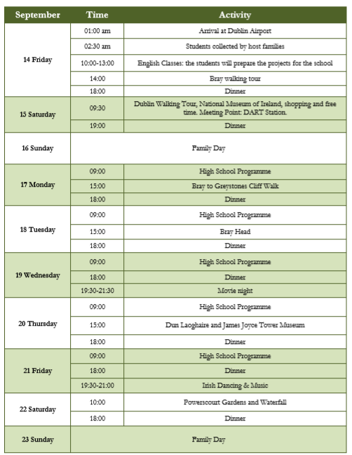 Video channel del colegio: https://www.youtube.com/channel/UCFKrlqNBP0ocD–TkHBmQjw/videosThe school Times are 08:15 until 15:20 each day. Wednesday is a half finishing at 12:35.Your students will be expected to be punctual and to participate fully during their 2 week stay.They must complete all homework assignments and projects that all the students will be given.Normally homework will take approximately 1 and half to 2 hours in the evening.One of the days the students will have an International Day, there will be proyects, food…from differents countriesThere are sports activities in the school that the students will be invited to partake in. These can happen in the afternoon or at the weekends.Planing de la semana inmersión en Irlanda